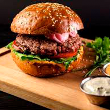 Ingredientes: Pão brioche, 1 hamburguer angus de 180g, bacon, milho, alface, tomate, mussarela, molho da casa